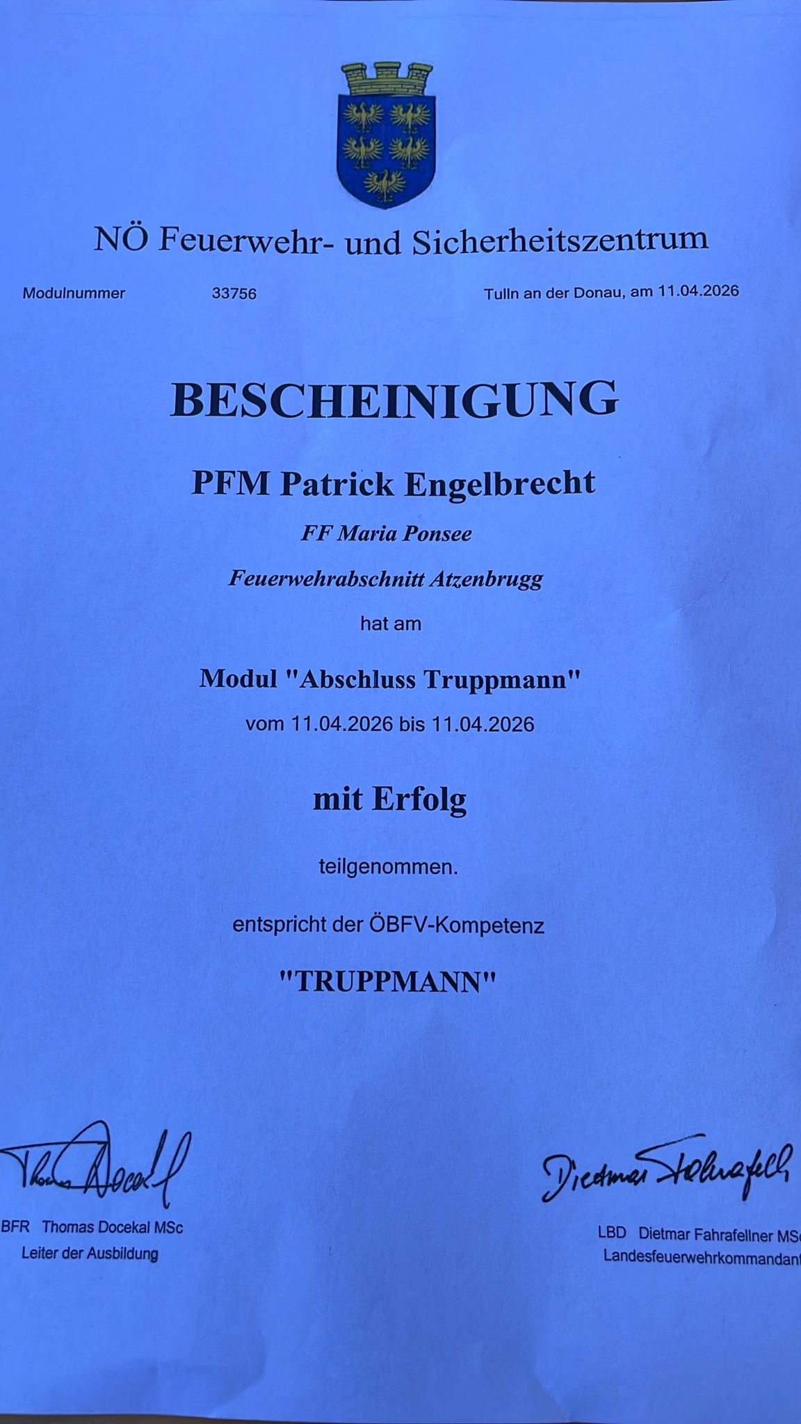 Nach intensiver Vorbereitung bei der Feuerwehr Maria Ponsee nahm Patrick Engelbrecht am Samstagnachmittag, dem 11. April 2026, am Abschlussmodul Truppmann in Michelhausen teil. Diese Weiterbildung baut auf den bereits in der eigenen Feuerwehr vermittelten Grundlagen auf und dient dazu, die Kenntnisse und Fähigkeiten im Feuerwehrdienst weiter zu vertiefen.